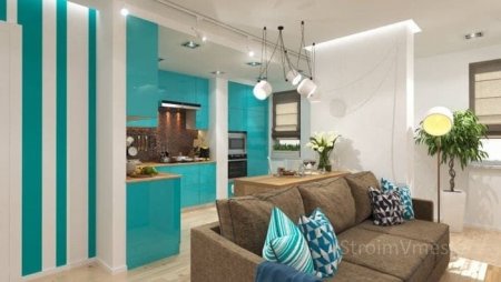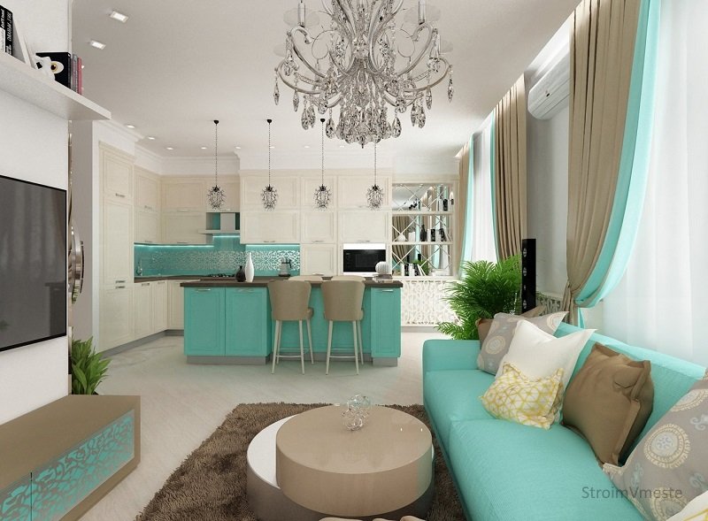 Бирюзовый – оптимальный выбор для объединения функциональных зон в единое целое. Его применение позволяет гармонично оформить квартиру из нескольких комнат. Для достижения результата достаточно окрасить стены бирюзовым или дополнить интерьер аксессуаром цвета Тиффани. Такой подход придаст комнатам схожесть, благодаря чему дизайн будет выглядеть целостным.