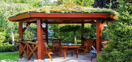 Популярный вариант – постройка из комбинированных материалов, например, например камня и дерева. Первый используют для обустройства столбов. Перекрытие выполняют из дерева. Древесину также можно сочетать с клинкерным кирпичом и металлом.