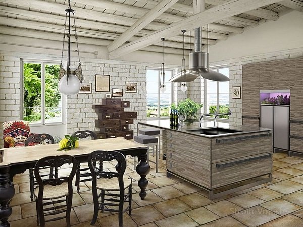 В кухне не обойтись без фартука из небольшой по размеру керамической плитки. Она должна иметь потертости и сколы. Стены можно украсить старыми фотографиями, зеркалами и часами. Гармонично впишутся в деревенский стиль разнообразные плетеные изделия, например, корзины для фруктов и кашпо для цветов.