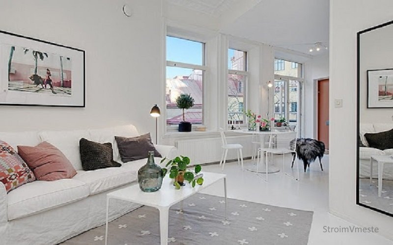 Для оформления интерьера чаще всего используется дерево. Его порода должна быть «легкой», а оттенок теплым. Такой подход способствует созданию уютной атмосферы. Для обустройства напольного покрытия можно использовать натуральный ламинат.Особое значение отводится освещению. В помещении должно быть достаточно естественного света. Идеальный вариант – квартира с белыми светами, освещенная солнечными лучами. Благодаря такому сочетанию жилье выглядит очень просторным. Панорамные окна и двери из стекла обеспечивают доступ в помещение достаточного количества света.