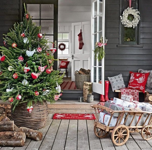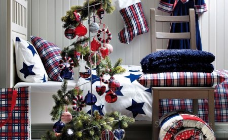 Скандинавский стиль не теряет актуальности. Для него характерны холодные цвета, сдержанность которых подчеркивается несколькими яркими акцентами. Для декорирования квартиры используются натуральные материалы. В качестве украшений для елки лучше всего подойдут шишки, желуди, орехи. Ярко-красные носки для подарков на стене придадут интерьеру праздничную изюминку.