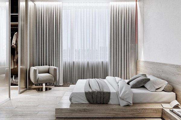 В представлении большинства людей минимализм ассоциируется с рулонными шторами. Их успешно можно заменить на тканевые изделия светлого оттенка, объемные складки которых придадут интерьеру мягкости.