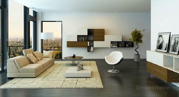 Минимализм допускает применение ковров, но их ворс не должен быть слишком длинный. Цветовая гамма должна совпадать с мебелью или стенами. В этом случае ковер гармонично впишется в лаконичный интерьер.