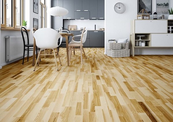 Сканди-интерьер не исключает применение ламината или плитки под дерево. Первый вариант рекомендуется использовать для отделки жилых помещений, второй — в «мокрых» зонах.