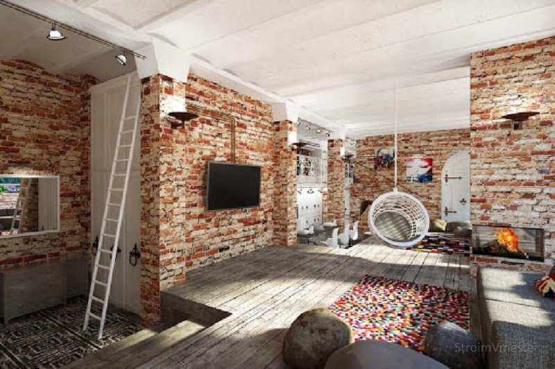 - деревянная или металлическая лестница. Благодаря высоким потолкам в помещении можно обустроить второй уровень. Он станет идеальным место для спальни или рабочей зоны;