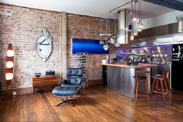 Квартира, оформленная в стиле лофт, напоминает промышленную мастерскую, что смотрится очень смело и оригинально в жилом помещении. Такой интерьер особенно выигрышно будет выглядеть в просторном помещении, наполненном солнечным светом. Особенность пространства — отсутствие перегородок. Двери предусмотрены только для ванны, санузла и подсобных помещений.В лофтовском интерьере гармонично сочетаются разные архитектурные решения: стены из потертого кирпича и зеркала, открытые инженерные системы и приборы освещения из хромированного материала.