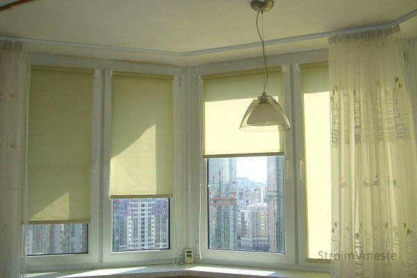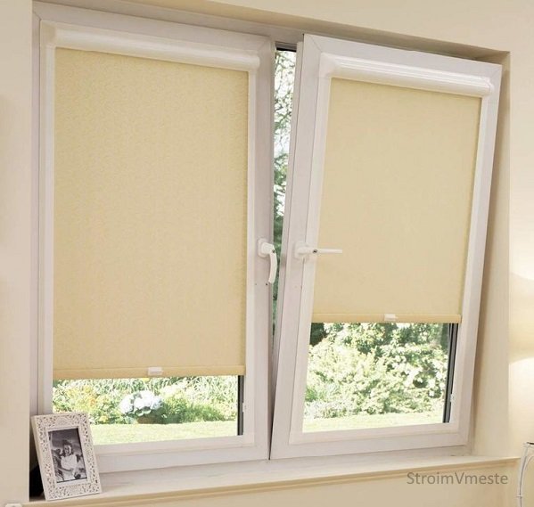 - Открытые оснащены основой, на которую наматывается ткань при скручивании. Также, имеется направляющая, размещённая внизу, которая представляет собой плотную планку. Такие конструкции применяют как на каждую створку по отдельности, так и на всё окно.