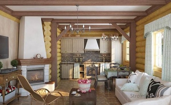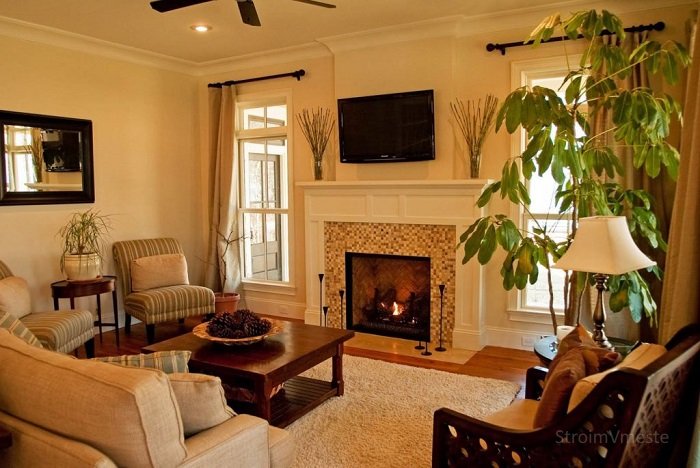 Для оформления гостиной в частном доме можно использовать камень. Его применение придаст помещению уют и подчеркнет природные мотивы в интерьере. Но необходимо соблюдать меру, иначе обстановка будет выглядеть слишком «тяжелой».
