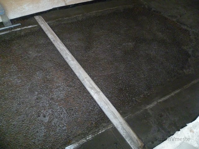 В процессе работы следует постоянно контролировать консистенцию раствора. Слишком жидкая смесь образует на полу «лужицы», на месте которых впоследствии возникнут впадины. Чтобы избежать появления неровностей, необходимо обрабатывать лужи правилом до их полного исчезновения.