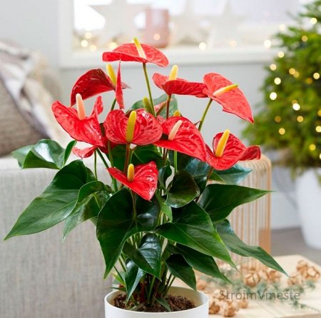 Растение выглядит очень нарядно благодаря глянцевым листьям и цветам, которые по форме напоминают сердечко. Антуриум бывает разных оттенков, от ярко-красного до нежно розового. Очень оригинально выглядит вазон с голубыми цветами.Растение цветет практически круглый год – с февраля по ноябрь. Для него нужно выбрать место с достаточным количеством света, но не на прямом солнце. Правильный уход – залог активного цветения антуриума. Зимой температура воздуха не должна превышать +15 градусов, летом - +28 градусов.