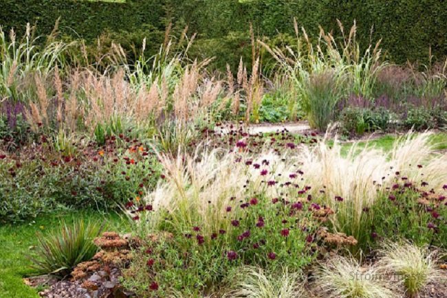 В концепцию естественного сада идеально вписываются клумбы из травы и злаков. Оригинальную композицию прекрасно дополнят полевые цветы. Такой ландшафтный прием способствует созданию романтического эффекта. Сад выглядит таинственно и необычно.